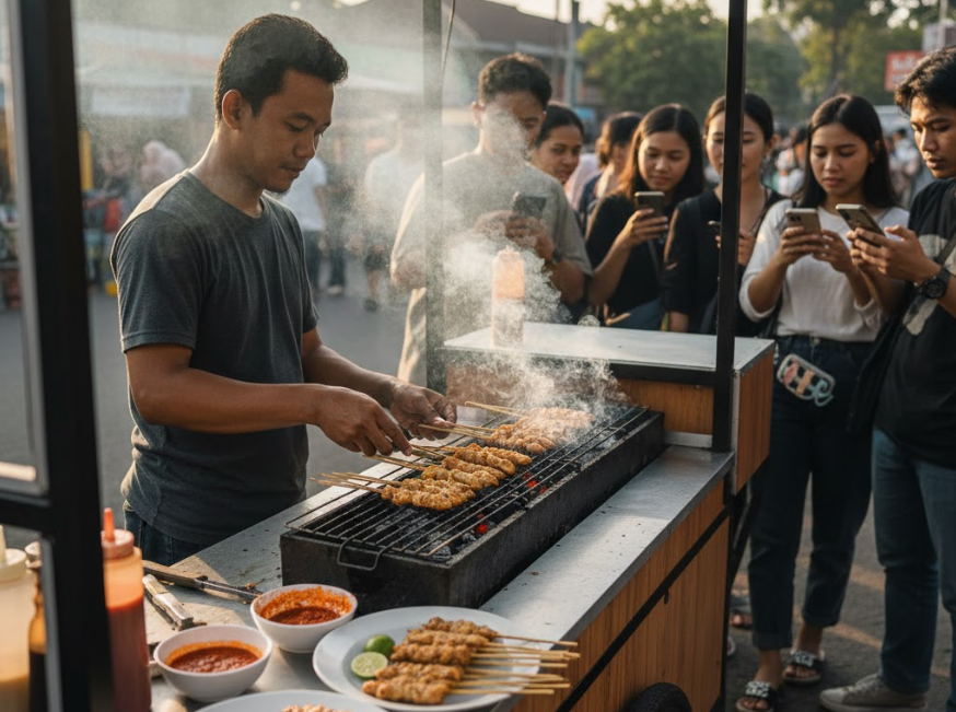 Pasar makanan siap saji di Indonesia terus menunjukkan peningkatan, terutama untuk konsep grab-and-go dan street food premium. Sate taichan berada di zona aman karena: